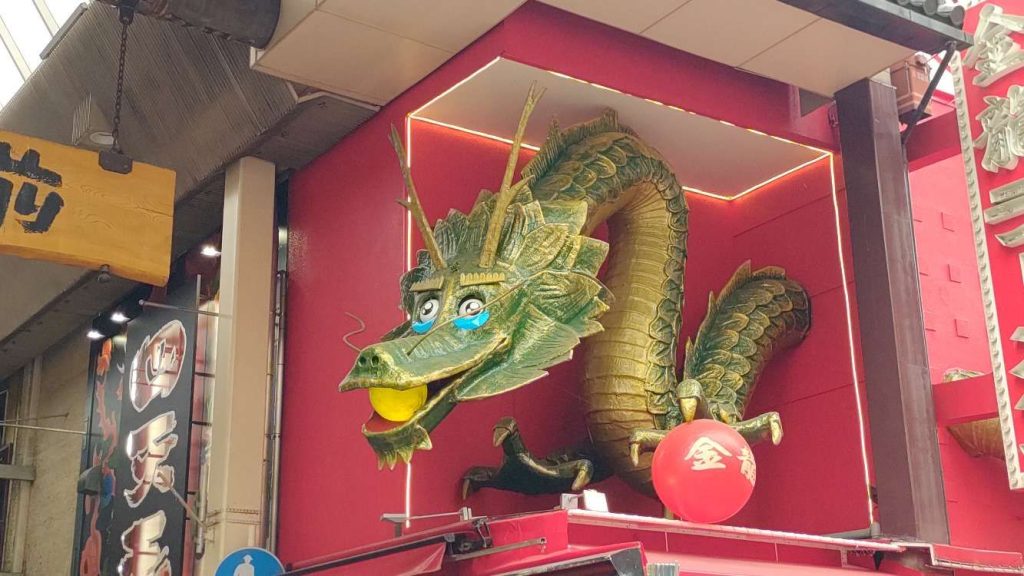 そのまま直進して、龍の看板で右折して「千日前商店街」に入ってください。