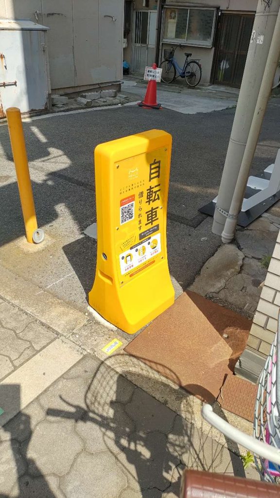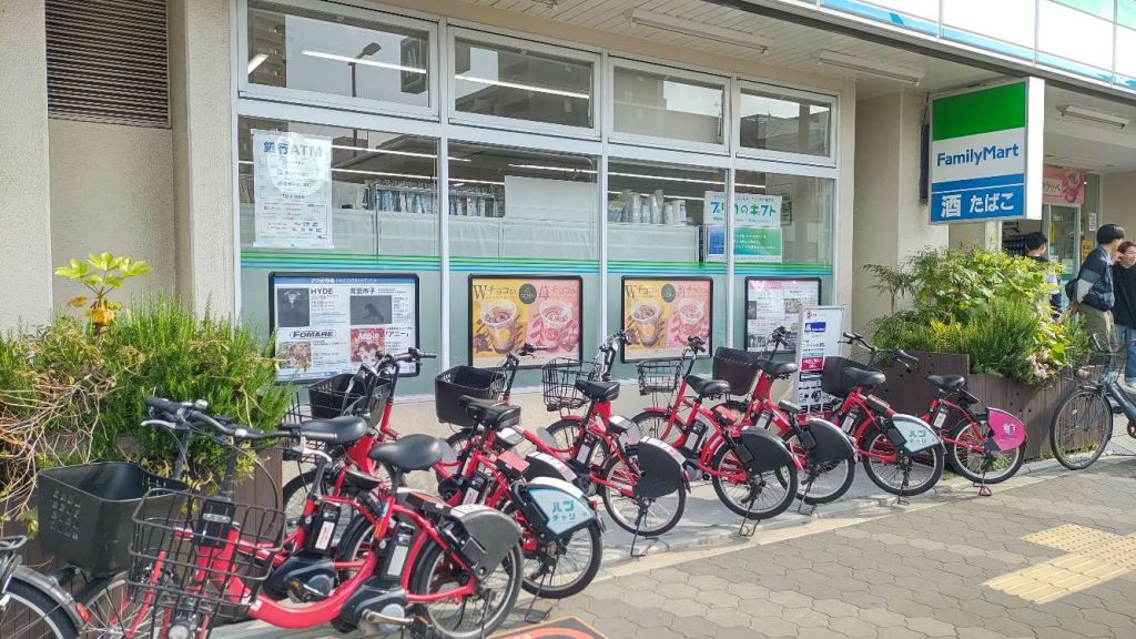 ファミマの前にはドコモのレンタサイクル、少し離れた場所にはハローサイクルのポートがあるので、シェアサイクルも利用できますよ。